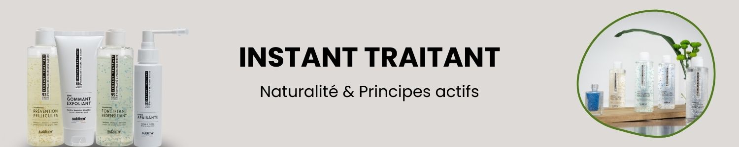 Instant Traitant est la gamme de massage de SUBLIMO dédiée au cuir chevelu et aux cheveux en manque d’équilibre : chute, pellicules, démangeaisons, excès de sébum, cheveux ternes ou fatigués. Chaque shampooing est conçu comme un soin lavant professionnel, à utiliser en massage, et peut être complété par des lotions ciblées ou un soin gommant exfoliant pour des cures plus profondes, directement inspirées du protocole salon.