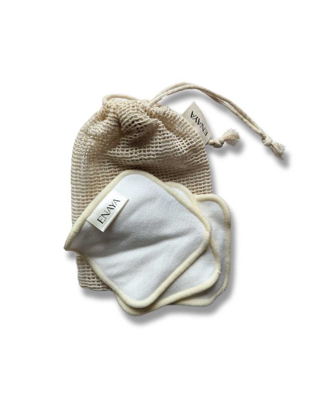Set Cotons Démaquillants (offert) : Fibres de bambou 100% naturel - Set 3 cotons réutilisables + pochette à coulisse coton recyclable.