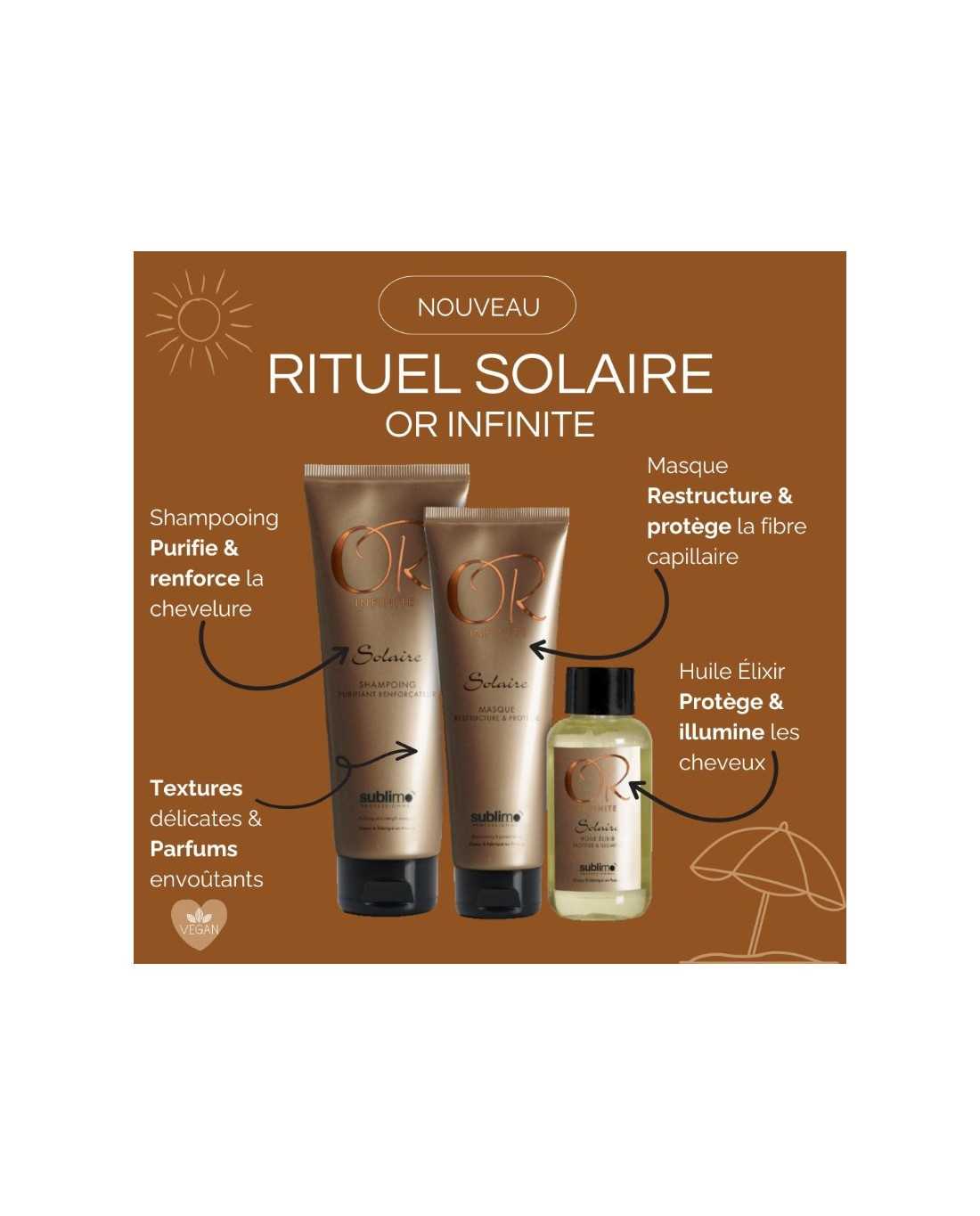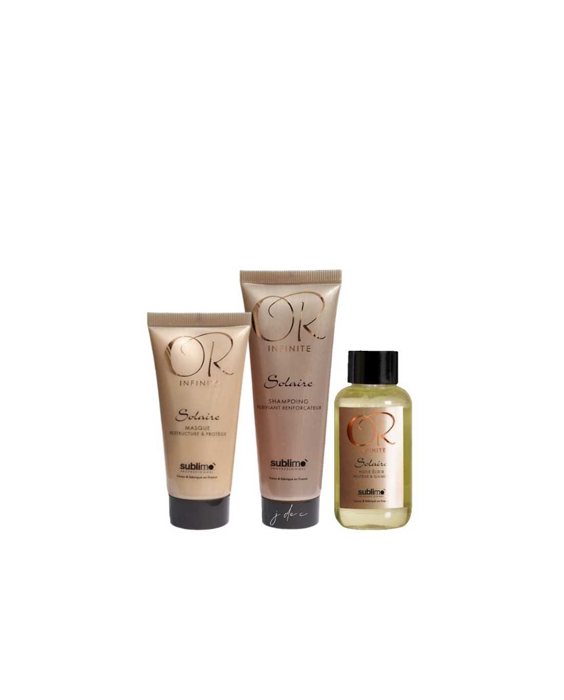 Le Mini Rituel Or Infinite Solaire offre une routine complète en format voyage pour prendre soin de vos cheveux avant, pendant et après l’exposition solaire. Ce trio de soins essentiels nettoie, répare et protège la fibre capillaire, tout en apportant éclat, douceur et une expérience sensorielle avec un parfum fleuri et fruité. Idéal pour préserver la beauté de vos cheveux où que vous soyez.